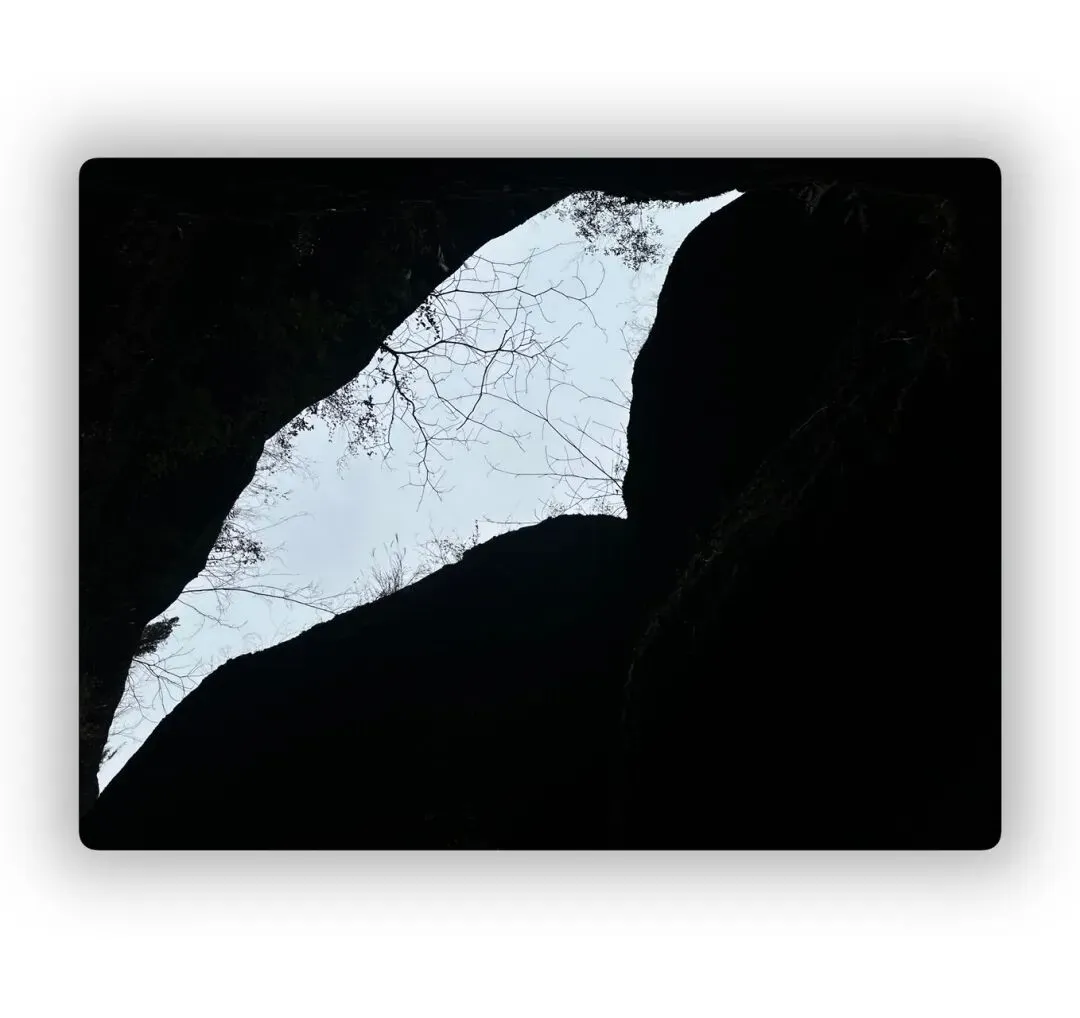 自水潭之中抬眼向上,一缕天光泻下,深潭的头顶,正是一个如弯月的洞口,天光洒入水潭。