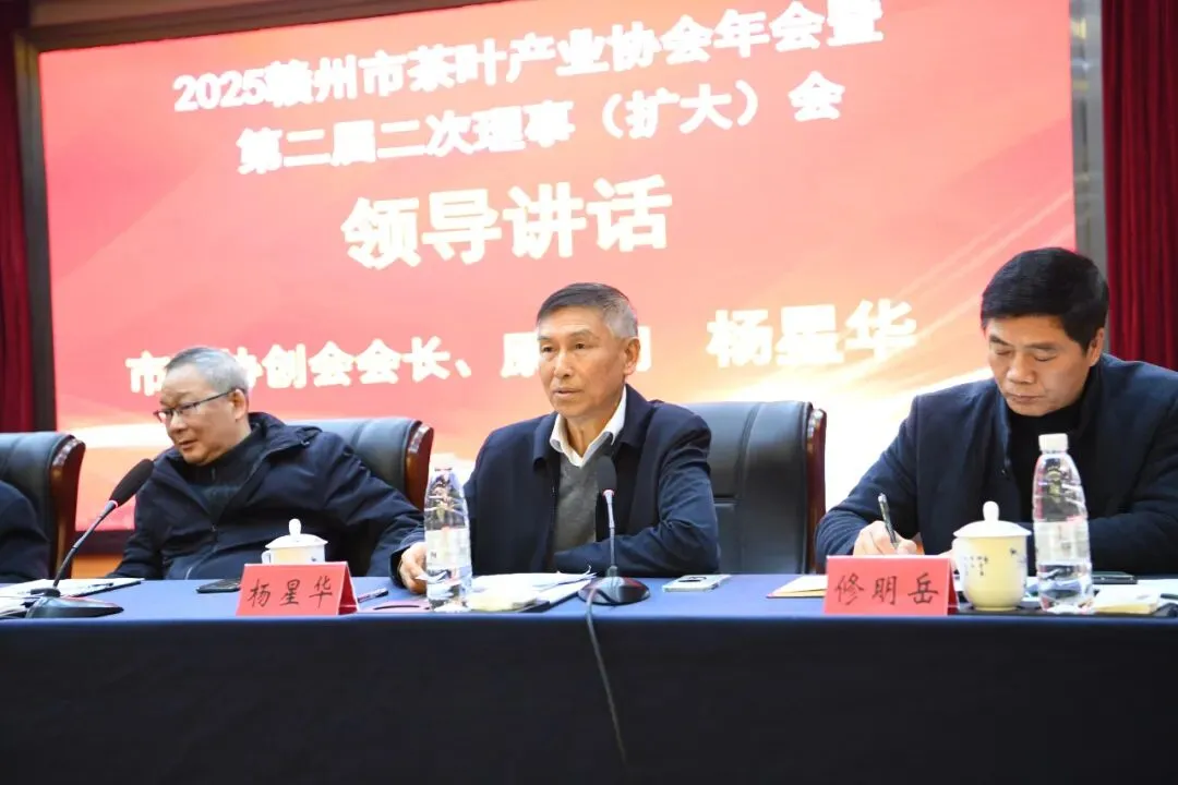 市茶协创会会长、原顾问杨星华在讲话中充分肯定新一届协会班子的工作成效,点赞赣南高山茶品牌价值与影响力的显著提升:一是新班子新气象。市茶协换届后短短一年多的时间里,在市委、市政府坚强领导和市农业农村局的重视关心,全体茶企茶人的创新驱动下,特别是在王会长领衔的新班子卓有成效的领导下,围绕“唱响赣南高山茶品牌”核心目标,聚焦党建引领,服务茶叶产业,争创一等协会工作理念,做了大量打基础、为长远和富有成效的工作,取得了可喜的成绩。二是老领导新作为。胡国铤主席85岁高龄,不用扬鞭自奋蹄,始终关心关注赣南茶产业的发展与进步,经常为茶协工作把关定调、指点方向。特别是经常撰文写诗作词,不断为赣南高山茶鼓与呼,为《放歌赣南高山茶》亲自作词。可说是烈士暮年,壮心不已,值得我们点赞学习!钟贤源老书记,每周坚持到市茶协指导工作,出谋划策,指点迷津,充分发挥老领导的作用,同样值得我们点赞学习!王业有会长接任后深入茶企调研,推出系列务实举措,成绩斐然。老领导们的关怀为产业发展注入了温暖力量。三是众茶企新风采。应众多茶企的邀请,去年底走访了一些茶企,留下深刻印象:崇义龙归茶场茶旅融合做得十分成功,硬件设施齐全,软件服务周到,让人流连忘返,打造的赣南高山茶旗舰店,经常开展茶叙活动,颇具特色,还有何赐华的抖音也做得非常好,有文化、有品味,让人印象深刻。上犹园村犹江绿月开始了大棚茶苗繁育培植,茶苗长势很好,开启了南征北战推销茶叶之路,实现了从产到销的全产业链发展。上犹营前雾毫茶场秋茶加工热火朝天,放养的鸡鸭鱼牛成群,晒场的香肠板鸭腊货亮眼,一派丰收喜人景象。兴国春赐福茶场茶园山顶的毛主席铜像雄伟壮观,阶梯上的灯光秀色彩斑斓、全市独有。兴国益香园公司的修总利用AI配茶,风味独特,用文言文写赣南高山茶,颇有文采。于都七彩茗峰小薛自播自导自销茶叶,像模像样,相信久久为功,必有回响。上犹笔架山公司发展迅猛,规模较大,现代化程度较高,不久前在该地成功举办了全市茶艺技能赛事活动。新近打造的商业街,成为全市看特色、看变化的一个重点。赣南高山茶第一旗舰店不但销售形势喜人,而且店里茶粉不断增长。等等,总的感觉是,在当前大环境不容乐观、经济承压的艰难情况下,我们的茶业企业家们始终乐观面对,始终自强不息,始终砥砺前行。
