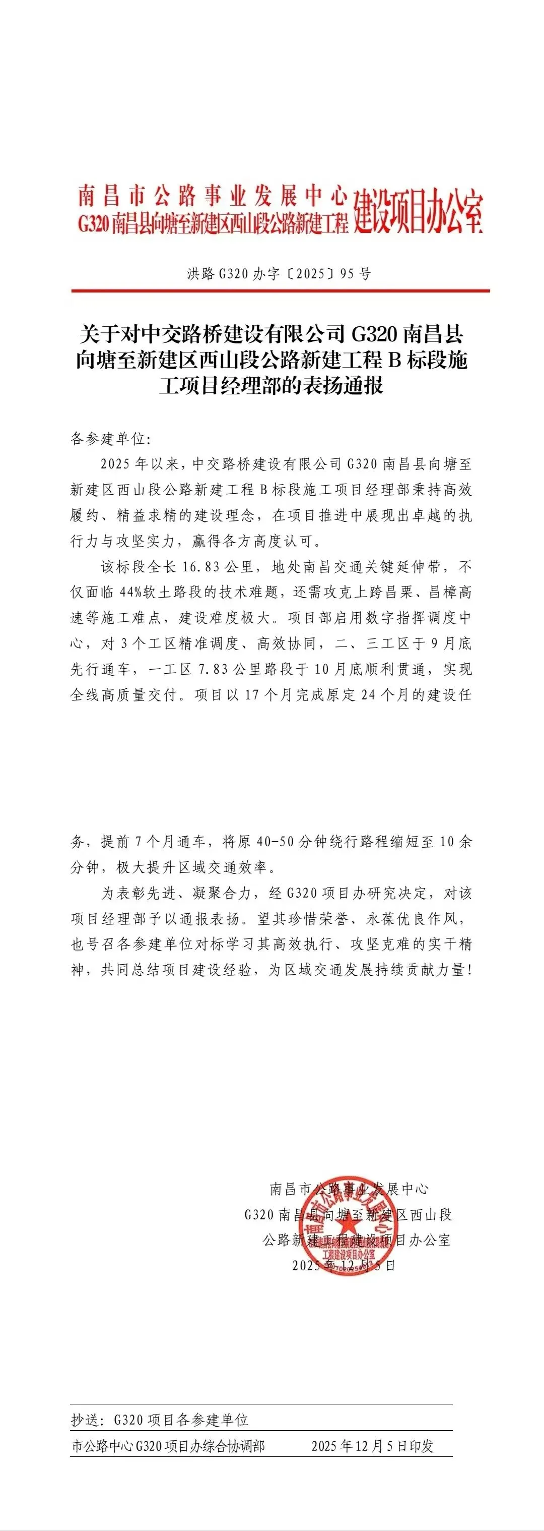 表扬信称,项目团队面临全长16.83公里,44%的软土路段、上跨多条高速等难题,项目部积极启用数字指挥调度中心,精准调度3个工区协同施工,提前7个月实现全线贯通,将原40-50分钟绕行路程缩短至10余分钟。团队以高效履约、精益求精的作风,圆满完成建设任务,获江西区域各方高度认可。