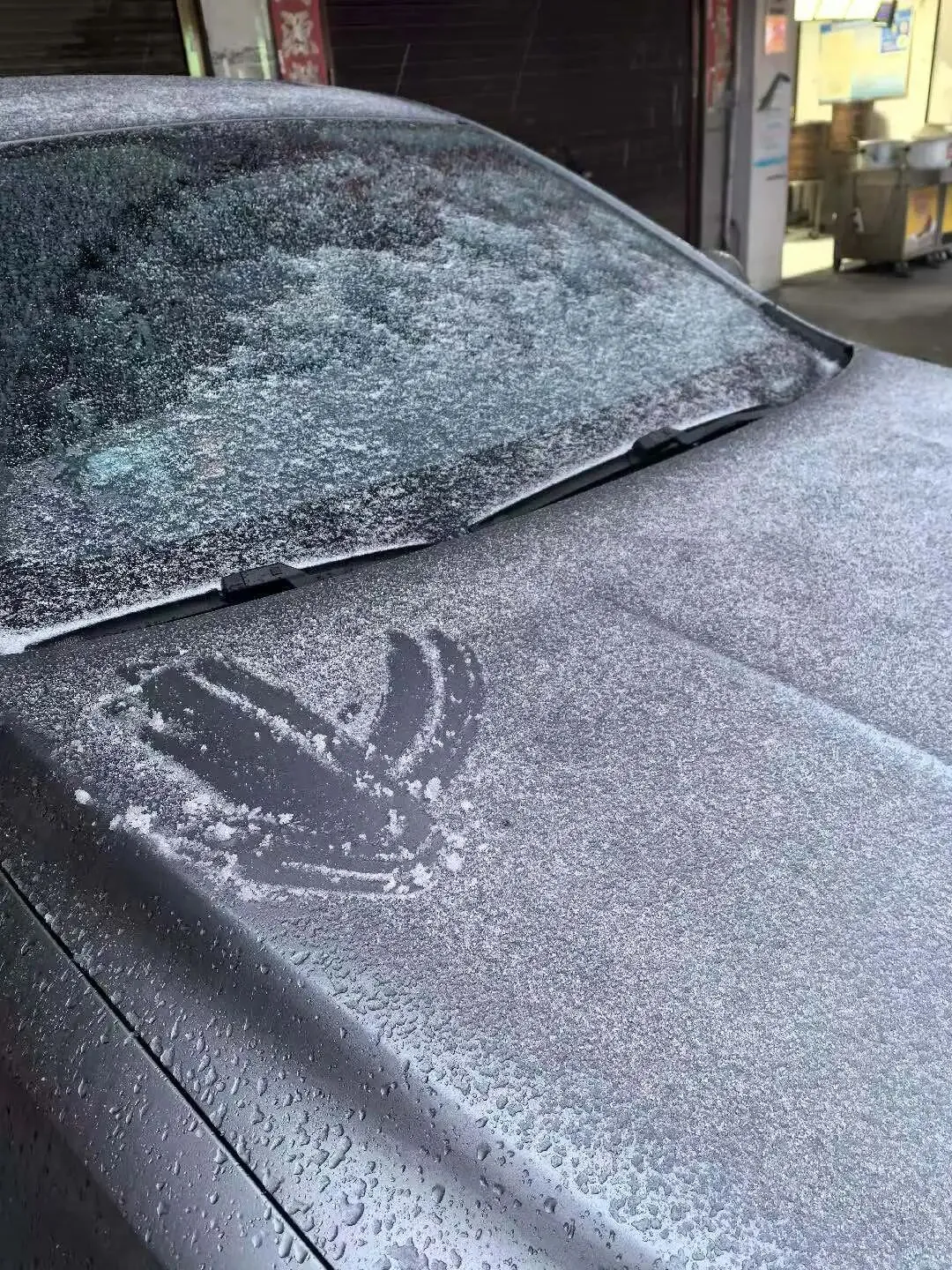 新城区的赣东大道上,车流在薄雾与碎雪中缓缓前行。停在路边的小车披上了银灰色的绒毯,后视镜上垂着几缕冰丝。
