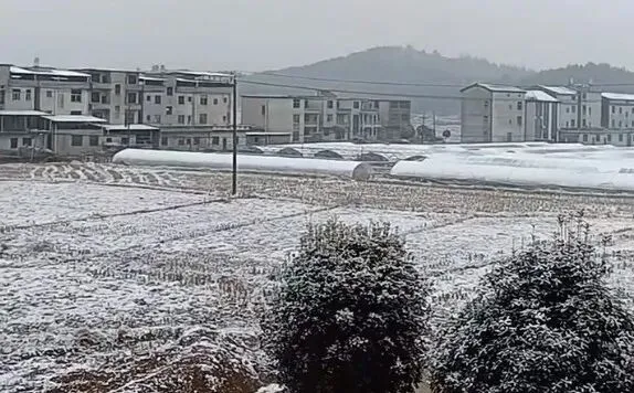 乡野的雪来得更直白些。城外的稻田里,残茬上积着匀净的雪,田埂边的矮树裹着蓬松的银装,与远处的村舍连成一片。大棚上的雪层在晨光里泛着柔光,仿佛在守护着即将萌发的春芽。这场初雪没有北方的凛冽,却带着江南独有的温柔。
