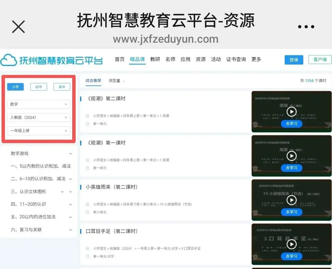 第二步:进入首页,点击任一选定区域,进入“抚州市中小学精品课”页面。