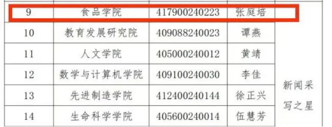 人物介绍:张庭培,男,汉族,中共党员,2024级发酵工程专业硕士研究生。他是信念坚定的宣传骨干,担任食品学院研究生会宣传部部长,全年牵头制作、审核并发布新闻稿五十余篇;他是学以致用的实践先锋,共获得国家级奖项五项,其中包括第十八届“挑战杯”全国大学生课外学术作品竞赛三等奖、第十九届“挑战杯”全国大学生课外学术作品竞赛二等奖、中国国际大学生创新大赛2024铜奖、中国食品科学技术学会“三只松鼠杯”全国二等奖等奖项;他是影像传播价值的宣传能手,多幅摄影作品刊登于中国青年报、大江网、江西工人报、南昌发布等权威媒体,展现出全面的专业素养与奉献精神。