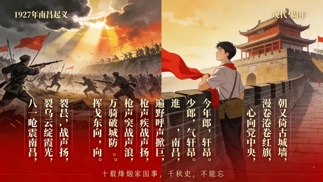 八一枪响震南昌,裂黑云,漫霞光。