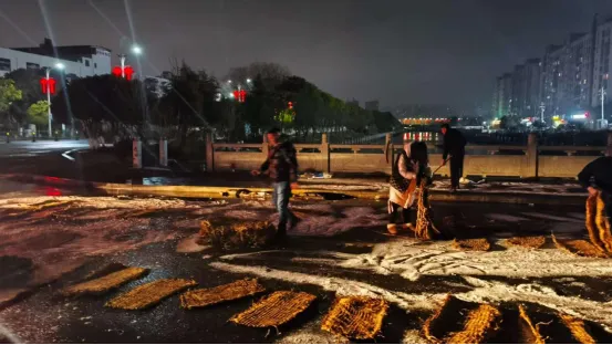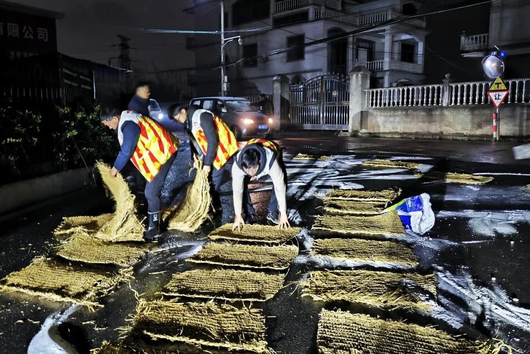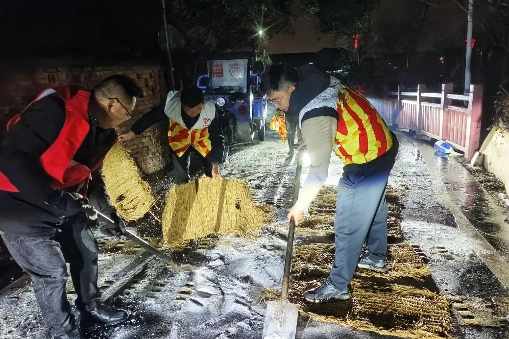 各村迅速组建临时应急队,连夜筹备融雪盐、草席、铁锹、扫帚等物资,即刻奔赴各隐患点位开展专项处置行动。队员们分工协作、顶寒作战,在结冰路段撒布融雪盐,加速冰层消融;在易滑路段逐一铺设草席,搭建防滑“安全垫”;对路面残留积水彻底清扫,有效降低二次结冰风险。同时,提醒过往车辆减速慢行、行人注意脚下安全,寒夜中忙碌的身影,构筑起守护道路安全的坚实防线。