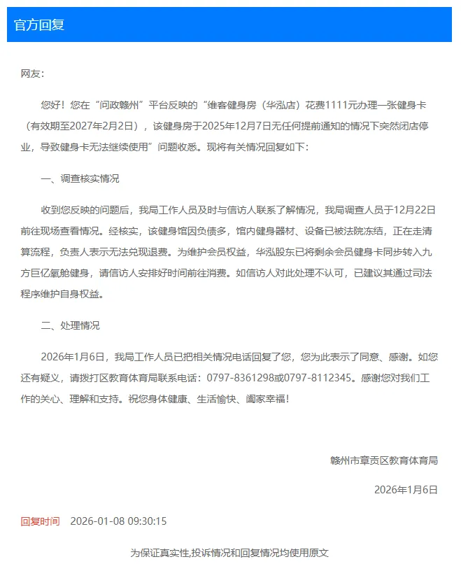 官方回复:收到您反映的问题后,我局工作人员及时与信访人联系了解情况,我局调查人员于12月22日前往现场查看情况。经核实,该健身馆因负债多,馆内健身器材、设备已被法院冻结,正在走清算流程,负责人表示无法兑现退费。为维护会员权益,华泓股东已将剩余会员健身卡同步转入九方巨亿氧舱健身,请信访人安排好时间前往消费。如信访人对此处理不认可,已建议其通过司法程序维护自身权益。