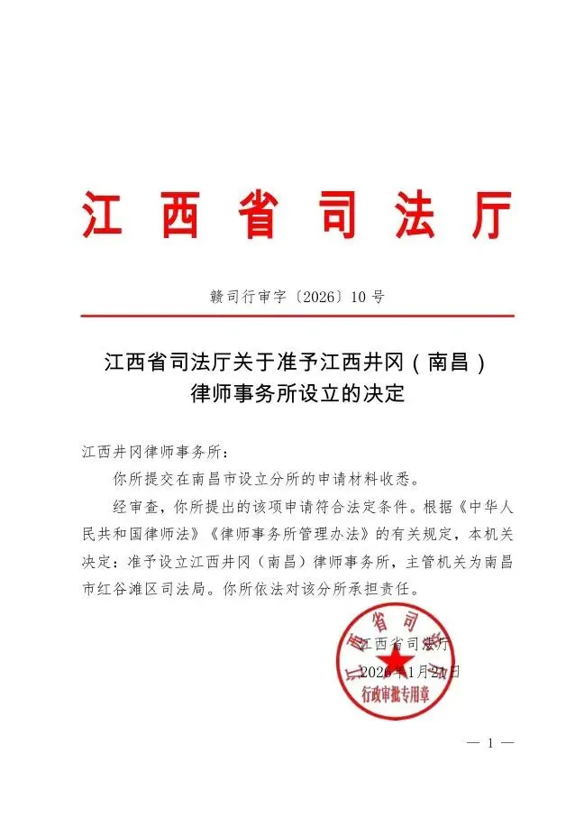 承势而上开新局,乘势笃行启新程。2026年1月21日,经江西省司法厅批准,江西井冈律师事务所南昌分所正式获批成立。南昌分所系我所跨市设立的第二家分所,对贯彻我所“一五”高质量战略发展规划,全力构建“吉安-赣州-南昌”三点联动及提升律所品牌化、专业化、规模化发展具有重要战略意义。为“立足江西、辐射全国”的发展愿景筑牢坚实根基,正式开启了井冈跨区域高质量发展的崭新阶段,成为井冈所实现跨越式发展的重要里程碑。