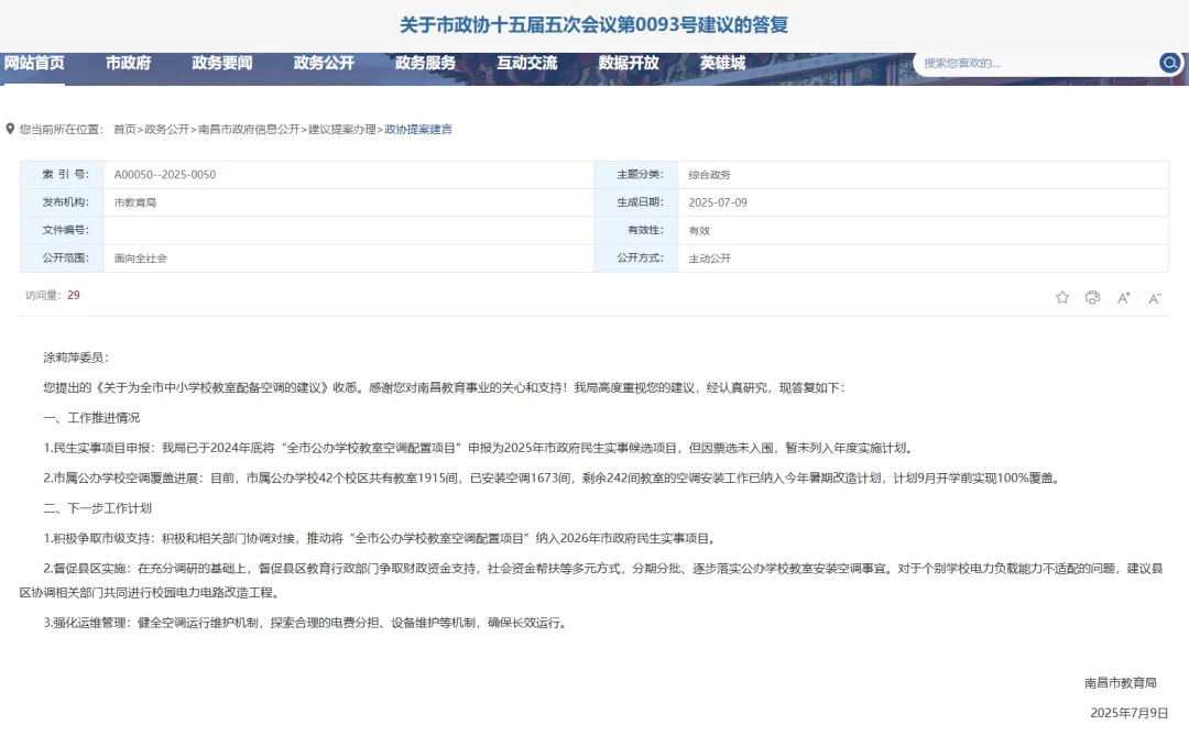 南昌市教育局在这份回复中称,南昌市属公办学校42个校区共有教室1915间,已安装空调1673间,剩余242间教室的空调安装工作已纳入2025年暑期改造计划,计划当年9月开学前实现100%覆盖。
