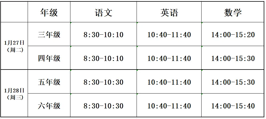 1月26日(周一) 上午8:30开始无纸化测试,下午照常上课及托管。