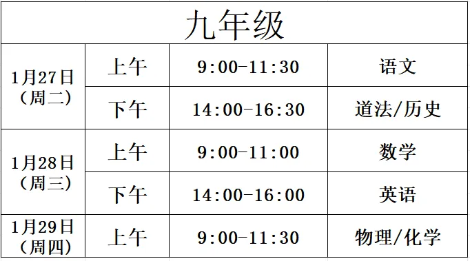 1月27日(周二)照常上课,1月28日(周三)期末学业水平测试