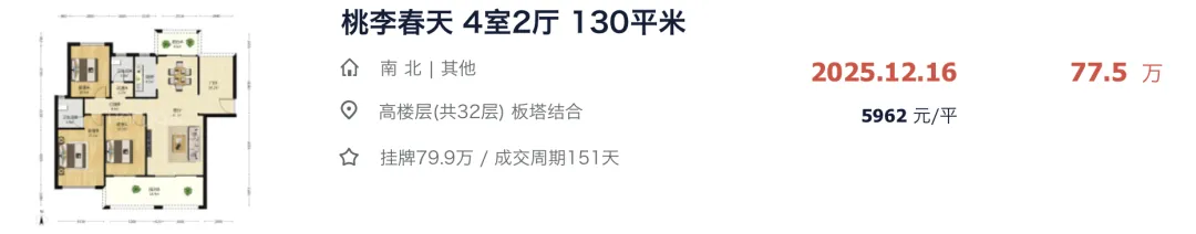 这是一套 130㎡ 四房两卫的高楼层房源,成交总价 77.5 万,成交单价 5962 元/㎡,没写交付状态估计是毛坯,成交周期为 151 天。该房源初始挂牌价为 110 万,经过 6 次频繁调价,降价 32.5 万后火速成交。