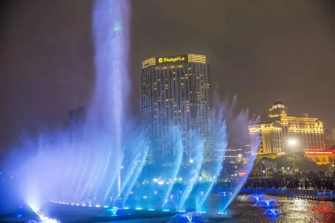 秋水广场喷泉看时间表,遇上大风大雨多半不喷,站位要早,占到正中那条线,灯光打到水面,手机也能拍出光轨。