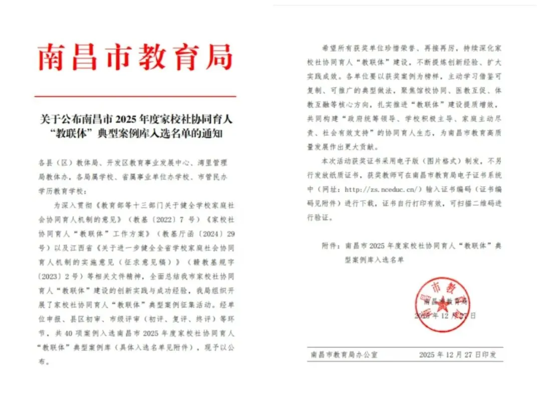近日,南昌市教育局公布了2025年度家校社协同育人“教联体”典型案例库入选名单。东湖区申报的三篇案例《东湖区教体局:深耕协同育人沃土构建全域育人生态》《邮政路小学教育集团:馆校协同育新苗 红色文脉润童心》《培智学校:融爱于行,聚力共生》成功入选。