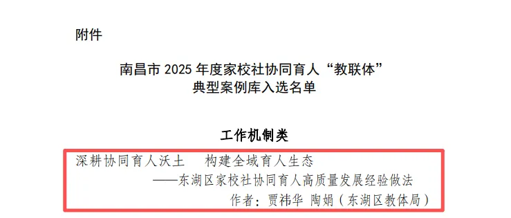 下一步,东湖区教体局将以此次入选为契机,进一步提炼创新经验、扩大实践成效,持续深化“教联体”内涵建设,推动形成更加科学、系统、高效的家校社协同育人新格局,为区域教育高质量发展注入新动力。
