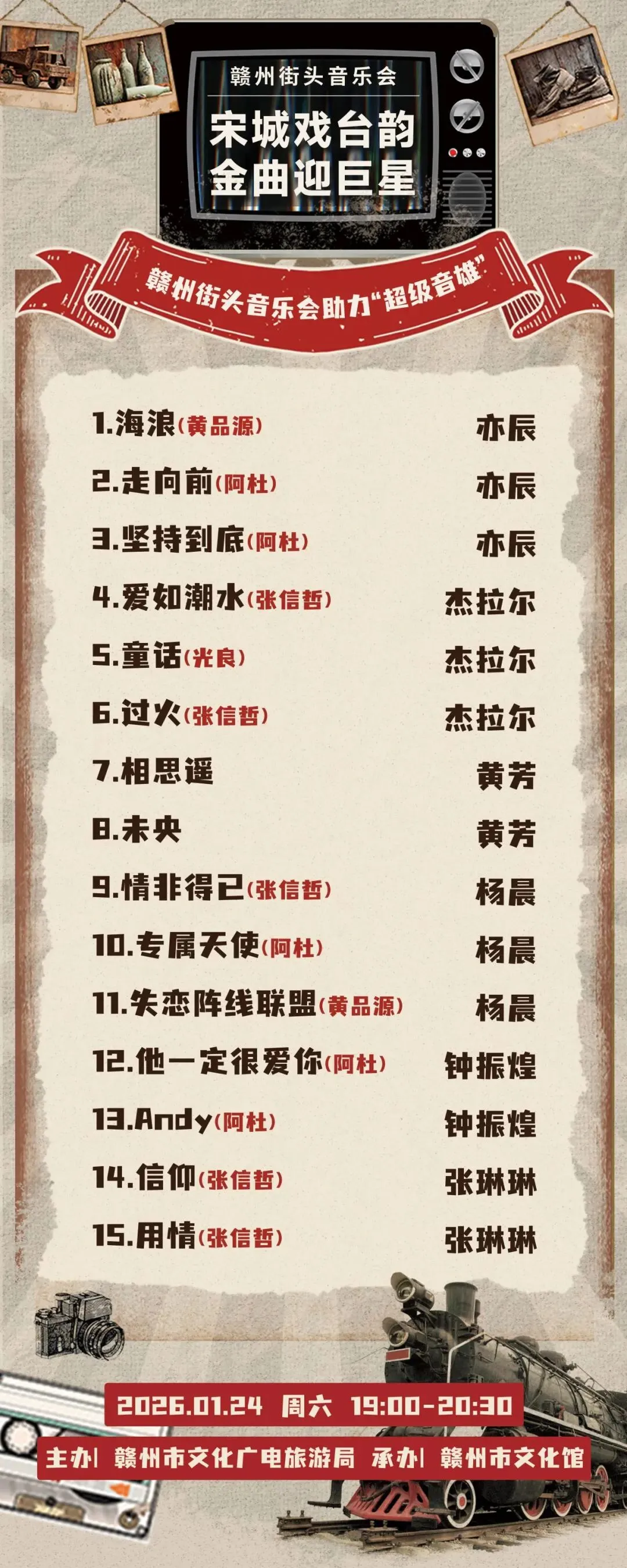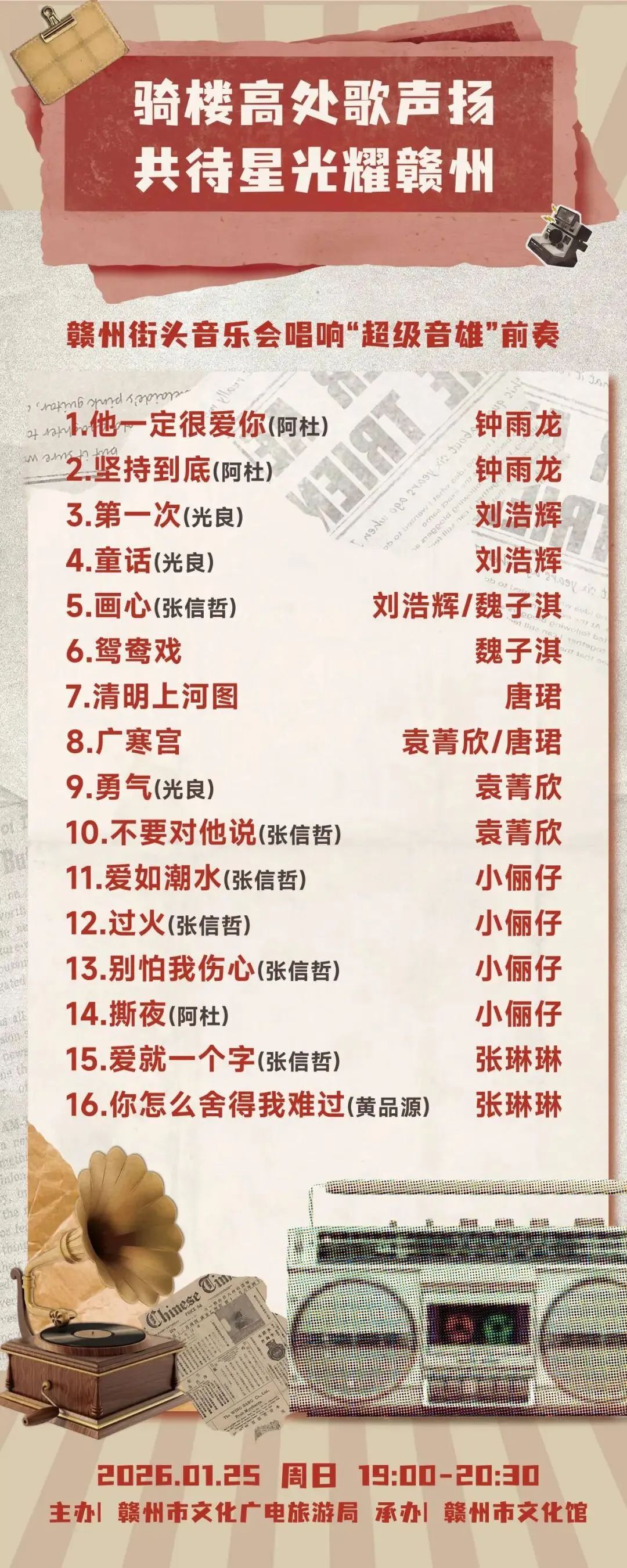 当骑楼烟火遇上时代金曲,当本土旋律邂逅巨星回声,赣州街头音乐会即将燃动阳明路!1月24日-25日连续两晚,标准钟夜市街用歌声为“超级音雄”预热,赴一场冬日里的音乐之约。活动现场还将抽取超级音雄巨星LIVE演唱会门票10张(24、25日每日抽取5张)。