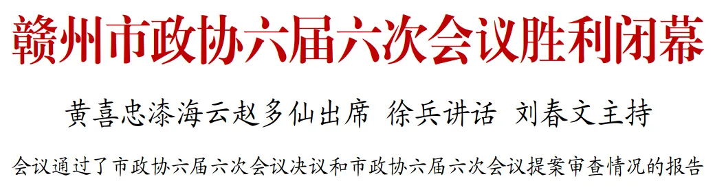 徐兵指出,2026年既是六届市政协的收官之年,也是“十五五”规划的开局起步之年。近期,市委书记黄喜忠在市委经济工作会议结束时,专门对领导干部提出了“认真、有效”的工作要求。希望全体委员将这一工作要求贯穿这一年履职全过程,以“站好最后一班岗”的尽责之心,珍惜宝贵履职时光,严谨对待每一次调研、每一份提案、每一场协商,做到思想不松懈、履职不松劲,以时不我待的紧迫感、舍我其谁的责任感,积极投身到为赣州“十五五”开好局、起好步的伟大实践中,镌刻下属于政协委员的履职印记,共同书写好本届政协的圆满答卷。