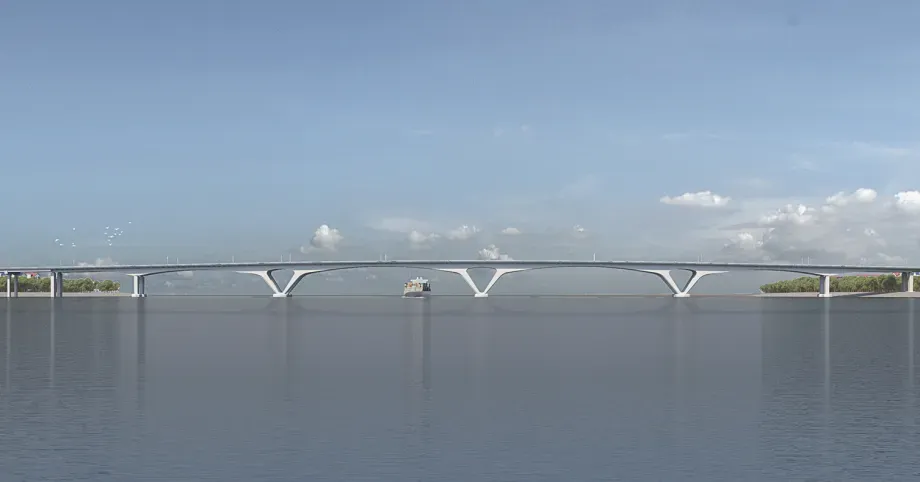 新南大道(G320)项目是南昌与长三角和长株潭城市群交通联系的重要通道,起于南昌县向塘镇原320国道与星城大道交叉口,终于新建区西山镇龙桥村,路线全长49.106公里,其中新建设里程25.561公里,利用老路里程23.545公里。项目A标段昌南大桥采用双向六车道一级公路标准建设,桥梁总长3852米,桥宽37.5米,主桥长840米,结构采用混合梁V型墩连续刚构桥,单孔最大跨径180米。