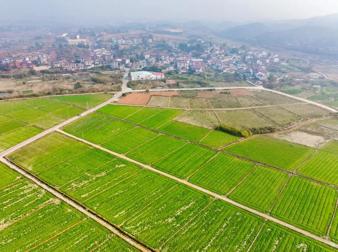 1月22日,南丰县琴城镇水北村,绿意盎然的油菜苗与田园、村庄、远山等交相辉映,形成一幅美丽的冬日田园画卷。