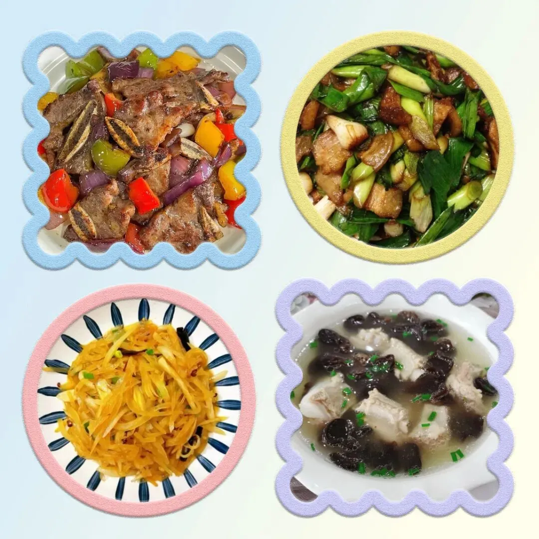 周二,红烧牛仔骨,大蒜炒肉,清炒白萝卜丝,木耳排骨汤。