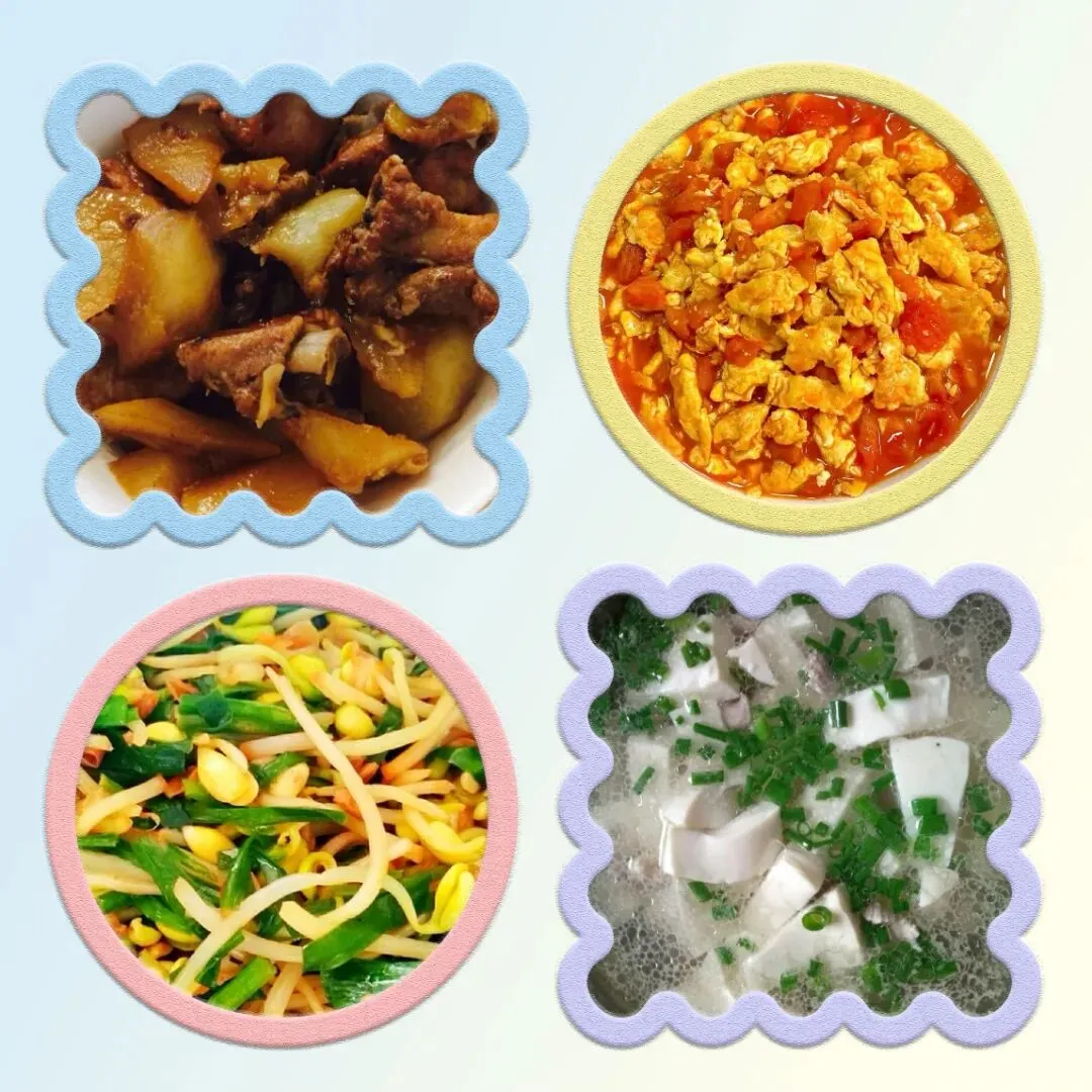 周五,萝卜烧肉,西红柿炒蛋,清炒豆芽,豆腐肉丝汤。
