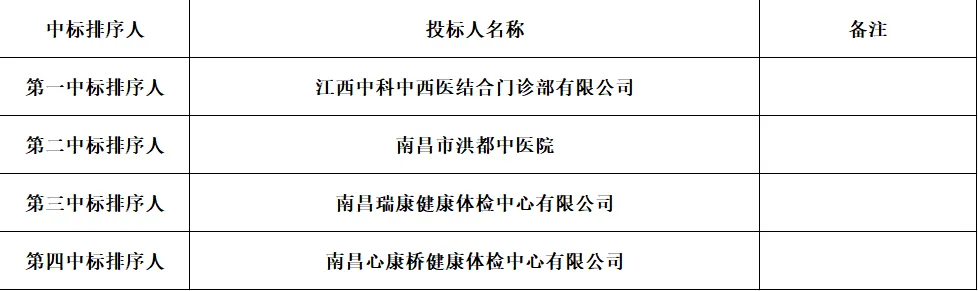 为切实保障教职工身体健康,规范体检服务管理,南昌市红谷滩区沂江路小学2025年教师健康体检项目招标活动于2026年1月22日下午13时30分(北京时间)在南昌市红谷滩区学府大道东新维翰路320号(南昌市红谷滩区南大附小第三分校)5楼会议室举行。经学校招标小组现场评议投票,现将本项目评标结果公示如下: