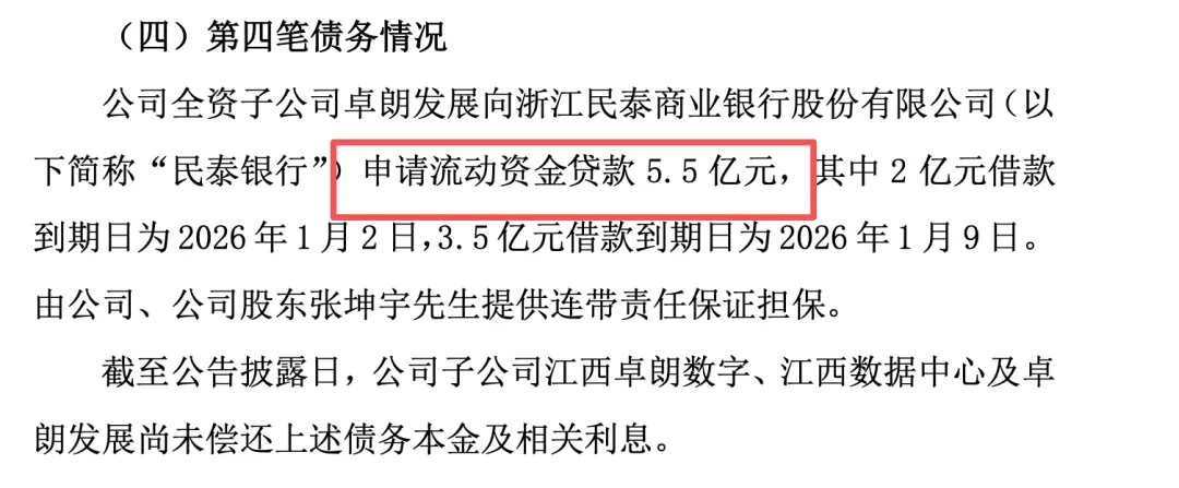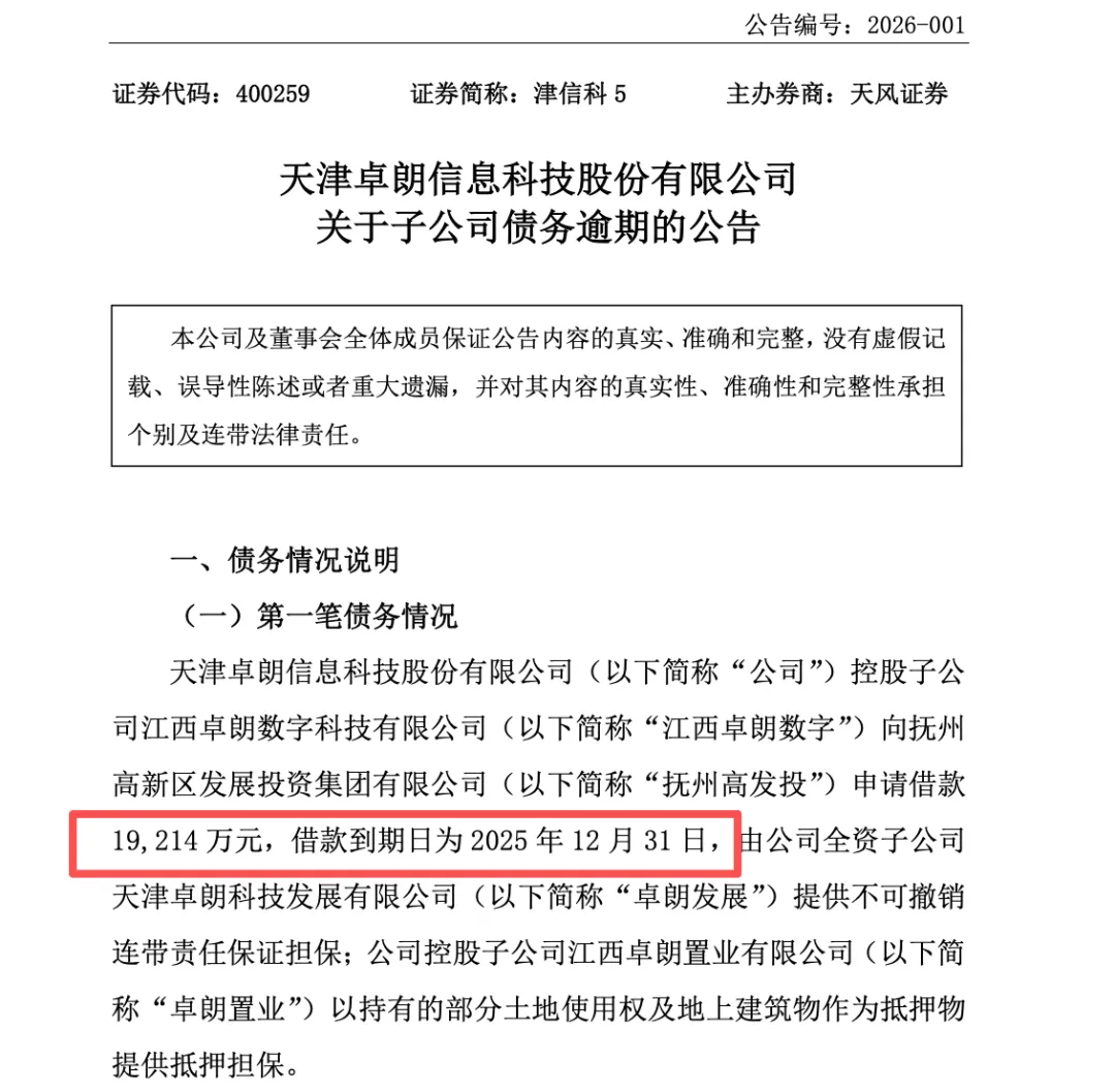 1月21日,抚州高新区发展投资集团有限公司(以下简称“抚州高发投”或“公司”)发布公告称,向参股公司江西卓朗数字科技有限公司(以下简称“江西卓朗”)提供的2.73亿元借款出现逾期。抚州高发投不再同意借款展期,拟通过司法程序,计划通过法拍相关抵质押资产收回相关款项。抚州高发投成立于2009年10月,是江西省抚州高新技术产业开发区重要的基础设施及保障房建设主体,也是政府投融资体制改革创新主体、公私合作承载主体。截至2025年6月末,公司注册资本为10.00亿元,实缴资本为3.00亿元;控股股东为抚州高新区区属国有资产投资集团有限公司,实际控制人为抚州市国有资产监督管理委员会。上述公告还披露,为通过国有资本支持引导抚州数字经济发展,抚州高发投与天津卓朗科技发展有限公司(以下简称“卓朗发展”)共同出资成立江西卓朗;其中卓朗发展持股比例为76%,为江西卓朗控股股东,抚州高发投持股比例为24%。由于江西卓朗固定资产投资规模较大、投资周期较长、经营资金较紧张,抚州高发投向江西卓朗提供借款;在江西卓朗经营不及预期的情况下,借款多次展期至2025年12月31日。上述借款均有土地使用权和地上建筑物抵押以及卓朗发展提供连带责任保证担保,整体回款风险较低。卓朗发展成立于2009年8月,控股股东为天津卓朗信息科技股份有限公司(以下简称“卓朗科技”),实际控制人为天津市人民政府国有资产监督管理委员会,注册资本和实缴资本均为10.00亿元。卓朗科技曾于2000年1月在上交所上市,因2019年至2023年年报存在虚假记载,触发重大违法强制退市情形,于2025年3月退市。据卓朗科技2024年年报披露,卓朗发展总资产为56.94亿元,净资产为19.08亿元,营业收入为12.46亿元,净利润为-2.19亿元。江西卓朗总资产为32.99亿元,净资产为12.73亿元,净利润为-145.70万元,营业收入则未披露。此前,卓朗科技于2026年1月5日发布关于子公司债务逾期的公告,其子公司共有4笔债务逾期,金额合计约8.52亿元。公告中称,江西卓朗向抚州高发投申请借款1.92亿元,卓朗发展提供不可撤销连带责任保证担保,卓朗科技控股子公司江西卓朗置业有限公司以持有的部分土地使用权及地上建筑物作为抵押物提供抵押担保。此外,卓朗发展向浙江民泰商业银行股份有限公司申请的流动资金贷款5.5亿元,由卓朗科技及其股东张坤宇提供连带责任保证担保。截至公告披露日,卓朗发展尚未偿还上述债务本金及相关利息。(来源:抚州高发投、卓朗科技发布公告,卓朗科技2024年年报,企业预警通等公开信息)