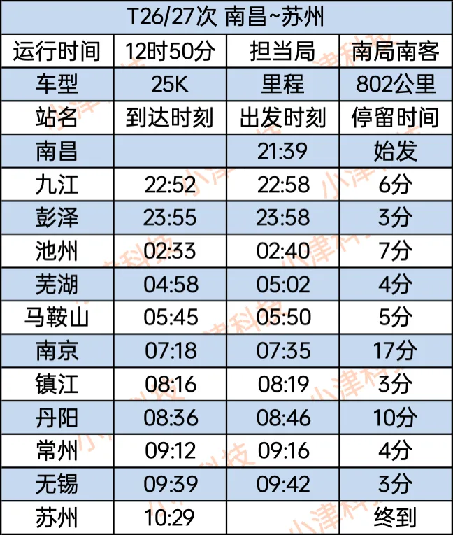 南昌站至苏州站T26/27次全程运行12小时50分钟,南昌站21:39始发,经停九江、彭泽、池州、芜湖、马鞍山、南京、镇江、丹阳、常州、无锡,次日10:29终到苏州站。