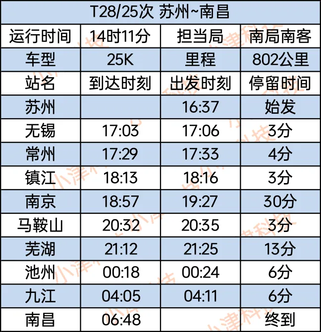 苏州站至南昌站T28/25次全程运行14小时11分,苏州站16:37始发,经停无锡、常州、镇江、南京、马鞍山、芜湖、池州、九江,次日6:48终到南昌站。