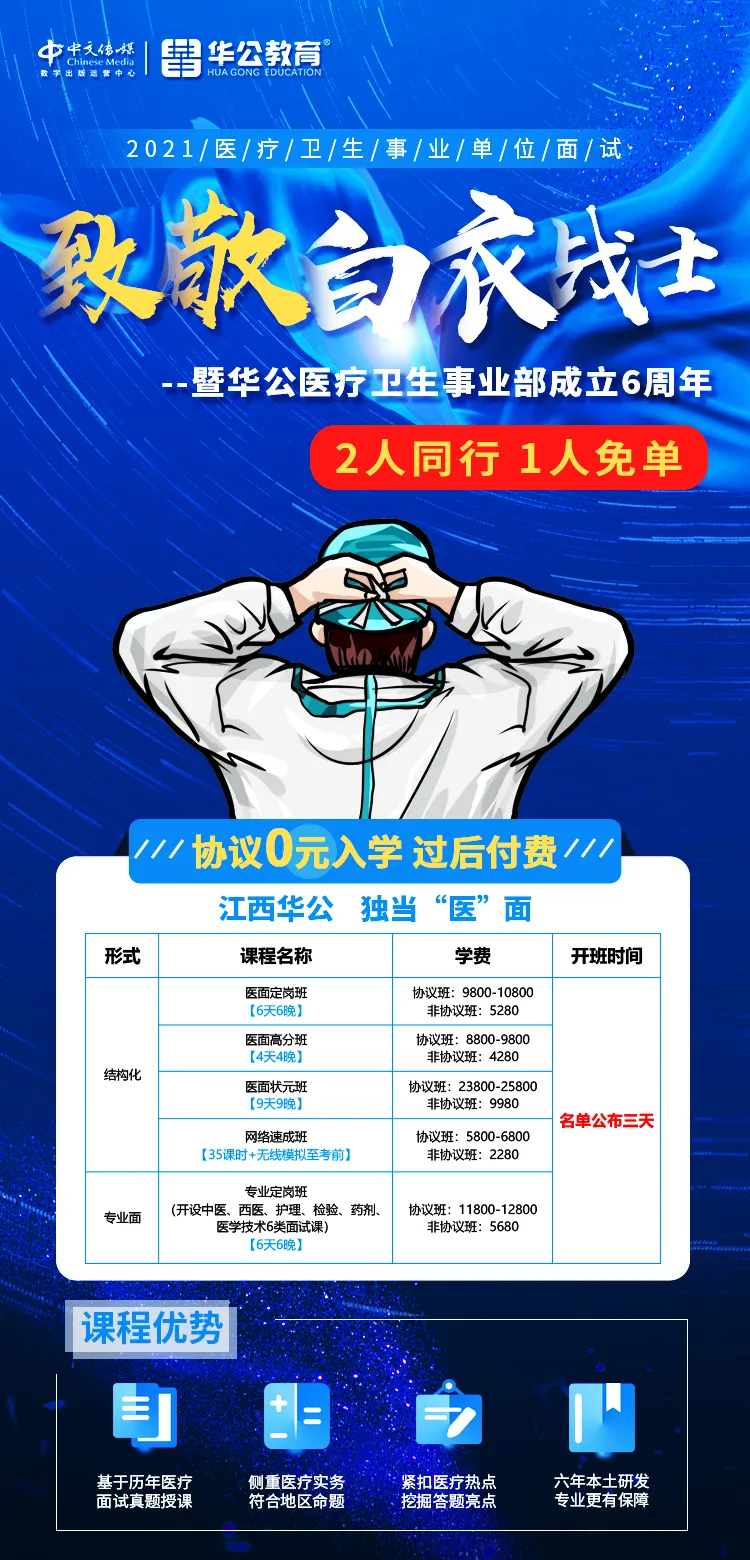 针对中医、西医、护理、检验、药剂、医学技术6类设班,分岗分类专项授课,面试讲师均为一线实战型讲师,对各自负责专业领域深有研究,均为各自专业领域的专家,授课经非常丰富,结合江西考情考务、授课资料、授课内容等多方面进行教研,保障授课效果。