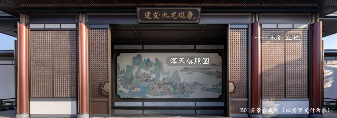 五间三门,八级高台,描金唐红立柱,双狮对立,高达10种材料组合的唐风大门,地面雕花大理石,超大尺寸定制唐代《海天落照图》,将归家仪式感做到极致。