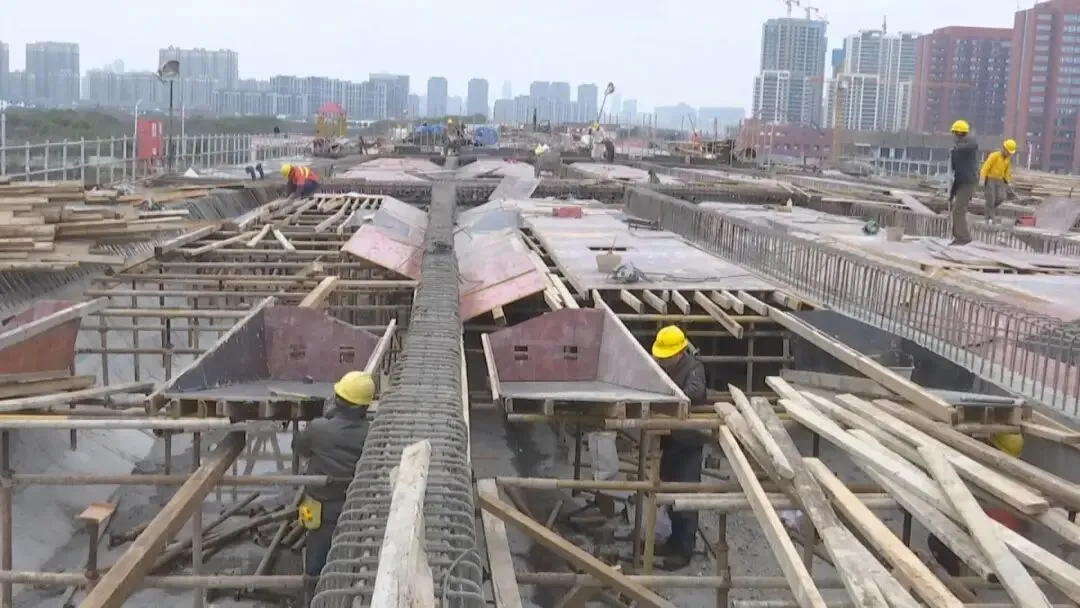 近日,在桃新大道项目一标段施工现场,200多名施工人员正在进行桥梁上部箱涵预制模板安装和钢筋焊接。