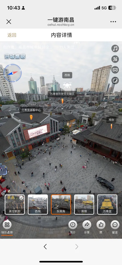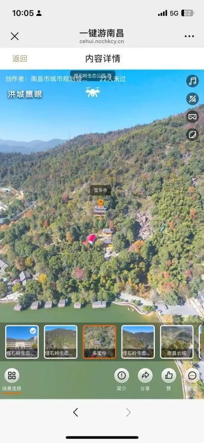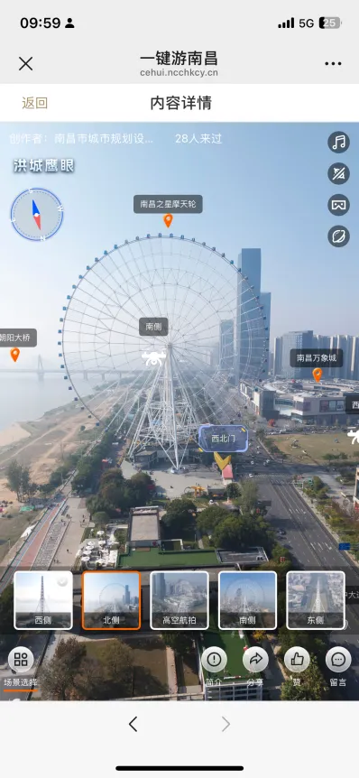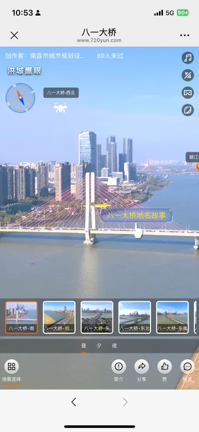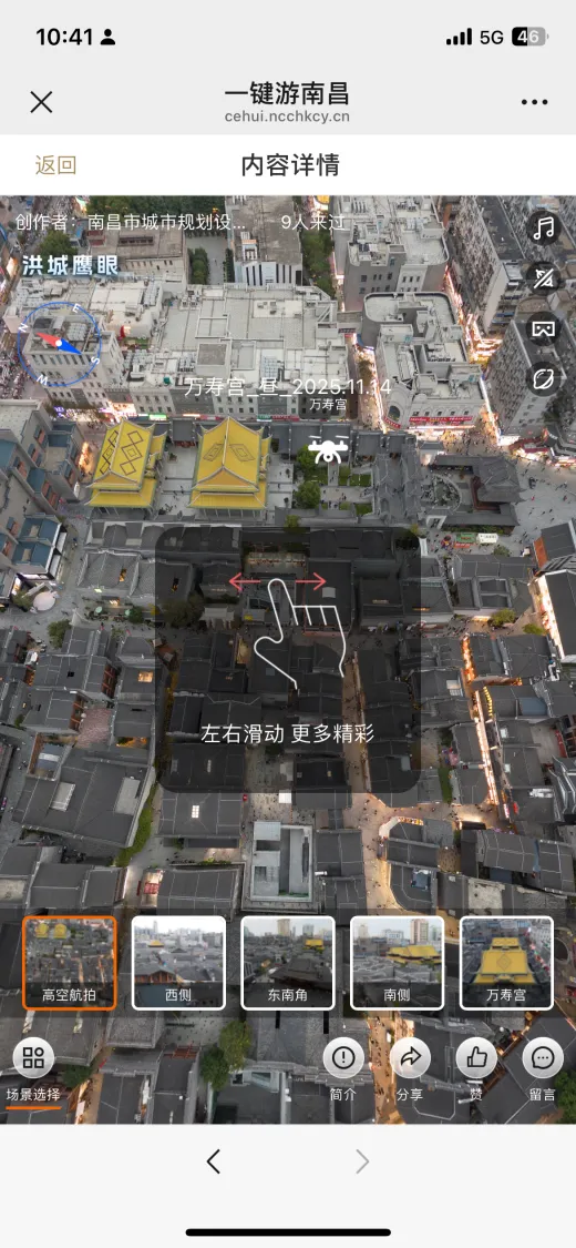 “一键游南昌”依托“洪城鹰眼”无人机航拍技术,对南昌市重要景点和景区进行多角度、多场景的全方位采集,并制作成720全景影像,打破时空壁垒,用户仅凭一部手机,便能“身临其境”漫游南昌各大景点,尽享沉浸式文旅体验。