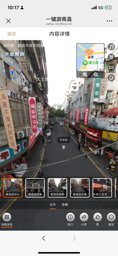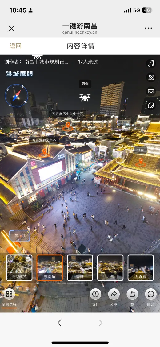 特别值得一提的是,平台运用的720全景技术,可实现上下左右全维度视角覆盖,为用户营造身临其境般的沉浸式体验。无论是滕王阁飞檐翘角的建筑细节与“赣水悠悠”的诗意盛景,梅岭国家森林公园的满山红叶与青绿山水,还是万寿宫历史文化街区白日里古建筑群的巍峨风貌、浓郁市井烟火与夜幕下灯火璀璨的如梦似幻,都能清晰呈现。平台还支持同一景点多时段景观呈现,真正达成“一部手机游遍洪城”的便捷体验。