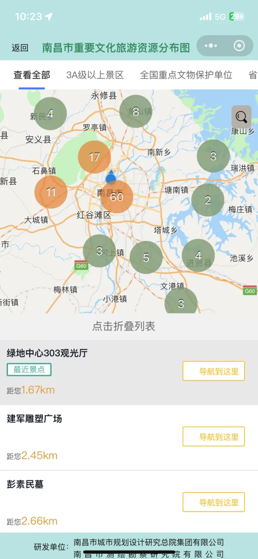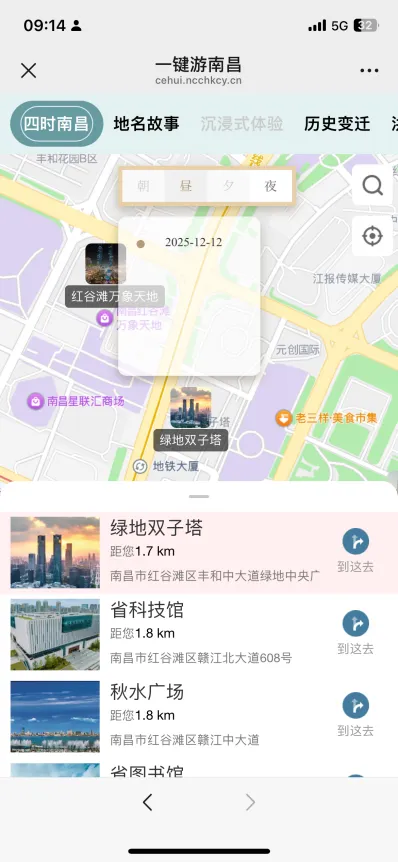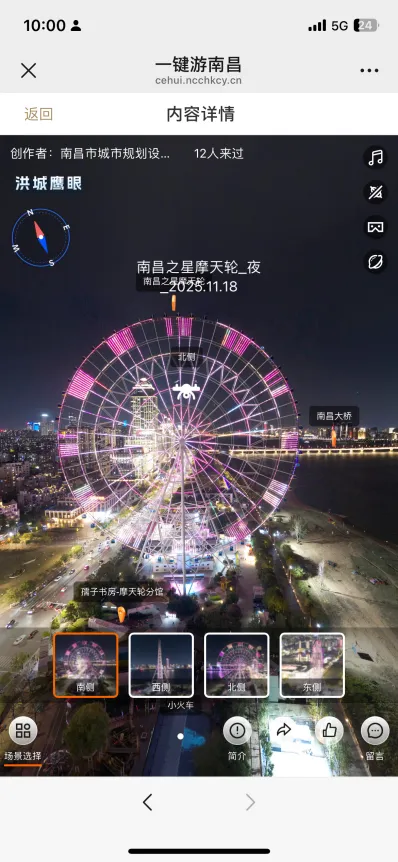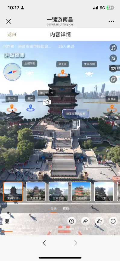 平台“四时南昌”模块已覆盖南昌市181处重要景点,从承载千年文脉的滕王阁到现代感十足的绿地双子塔,从层林尽染的梅岭国家森林公园到赣江之滨的“南昌之星”摩天轮,从南昌汉代海昏侯国遗址国家考古遗址公园到充满市井气息的绳金塔历史文化街区,每个景点均提供720全景影像,朝、昼、夕、夜各时段景色各异,满足用户全天候观赏需求。