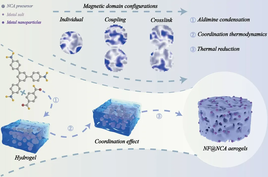 通过新颖的热力学控制配位策略,实现了磁性纳米颗粒间距的精确调控。根据热力学理论,配位反应伴随焓减过程,使自由金属阳离子不稳定,从而驱动配位键的形成。具体而言,选择具有三个氨基的1,3,5-三(4-氨基苯基)苯(TAPB)与对苯二醛(PDA)通过简单的醛亚胺缩合反应,构建具有固定周期性金属配位位点的水凝胶网络。随后的金属盐浸渍通过自下而上的配位策略,将镍和铁离子均匀引入水凝胶中,进一步稳定网络结构。这种定向配位机制确保金属离子以预定的均匀分散方式引入,为精确的结构控制奠定基础。通过调制磁性金属盐溶液的浓度,实现了磁畴构型的精确调控。