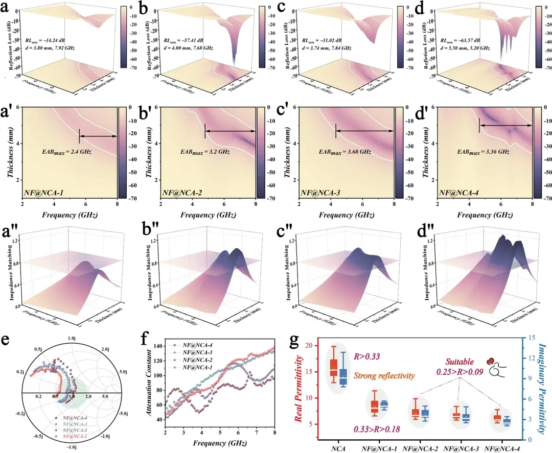 图3. NF@NCA复合材料的EMWA性能。a-a"NF@NCA-1、b-b"NF@NCA-2、c-c"NF@NCA-3和d-d"NF@NCA-4的三维RL映射、二维EAB映射及三维阻抗匹配图。e 厚度为4.69mm的Smith图。f NF@NCA复合材料的衰减常数。g NCA及NF@NCA复合材料的复介电常数。