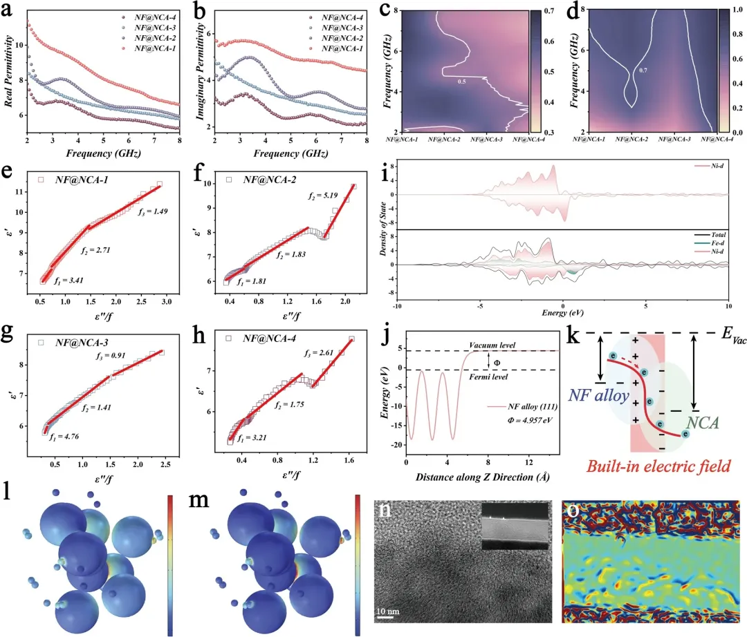 图4. NF@NCA复合材料的介电损耗机制。a-b 介电常数实部与虚部,c 介电损耗正切,d极化百分比,e-h NF @NCA复合材料的极化弛豫行为。i Ni与NF合金的态密度(DOS)。j NF合金(111)晶面的工作函数。k 内置电场示意图。l 电场损耗。m 功率损耗密度。n-o TEM插图的电子全息图及电荷密度分布图。