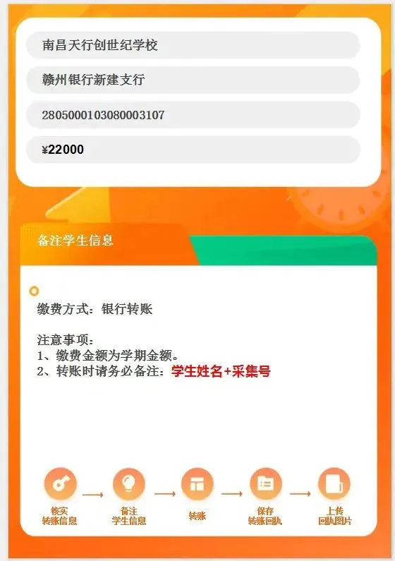 家长通过网上银行或手机银行直接将学费转入学校对公账户——“转账附言”栏必须备注:学生姓名+采集号——登录“昌通码” 义务教育智慧入学数字平台,根据提示上传电子回单(请在7月18日中午12点前完成)。