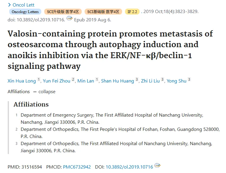 题目:Valosin-containing protein promotes metastasis of osteosarcoma through autophagy induction and anoikis inhibition via the ERK/NF-κβ/beclin-1 signaling pathway