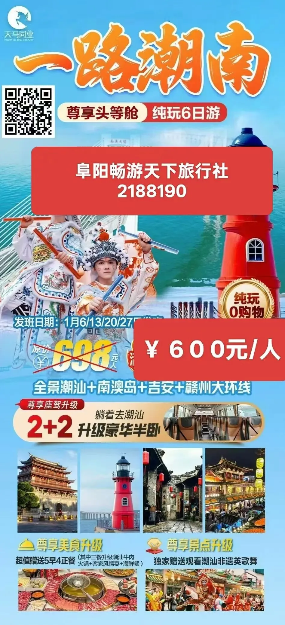 5降了,潮汕-小南昌-赣州古城-潮汕-蜜月岛-南澳岛-英哥舞-汽车纯玩升级版2+1或者2+2豪华航空座椅可卧可座潮州、汕头、南澳岛、潮汕、 大环游等纯玩不进购物店每人600元(送4早4正餐+我社加2个正餐+我社途中多送2个打包餐+8个餐),发团时间是2月3号(周二),年龄放宽到80周岁(身体好才可以出游),广东1--2月份温度15-25度左右,报名送10斤面粉,会员报名多送1提抽纸,属龙(吉祥小龙多一把面条)。