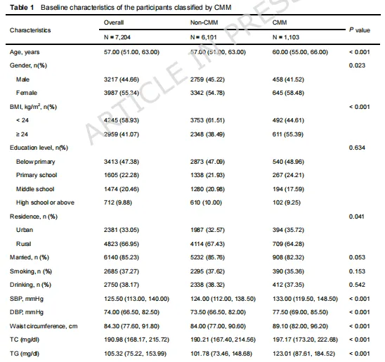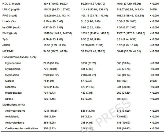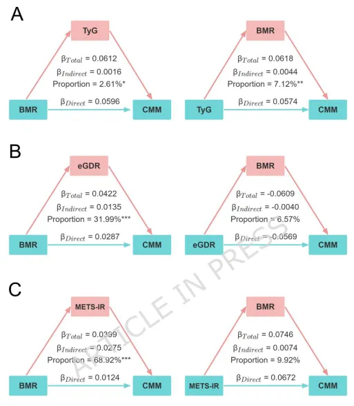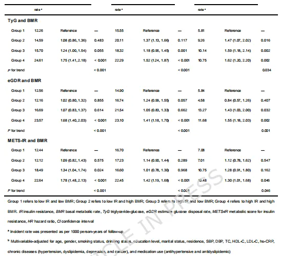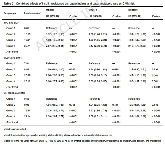 Cox回归分析表明,在完全校正后,高胰岛素抵抗(IR)且高基础代谢率(BMR)的参与者罹患心血管代谢多病共存(CMM)的风险最高,其中高TyG与高BMR组合风险增加2.13倍,低eGDR与高BMR、高METS - IR与高BMR组合也有类似风险升高情况(表2)。