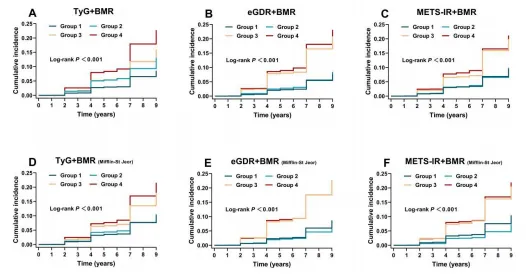 图 2.按胰岛素抵抗(IR)替代指标水平和基础代谢率(BMR)分层的 CMM 累积发生率Kaplan-Meier曲线(A-F)