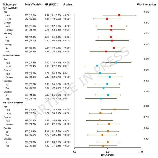 研究通过Kaplan - Meier曲线发现高胰岛素抵抗(IR)且高基础代谢率(BMR)者心血管代谢多病共存(CMM)累积发病率最高,低IR且低BMR者发病率最低;敏感性分析显示,采用Harris - Benedict和Mifflin - St Jeor公式重算BMR时,TyG和eGDR与BMR的联合关联稳健,而METS - IR的关联性减弱(图2)。