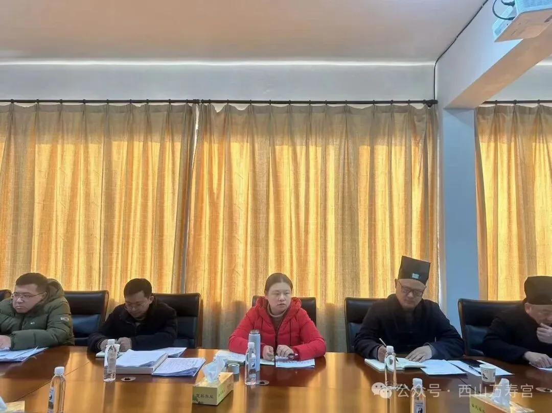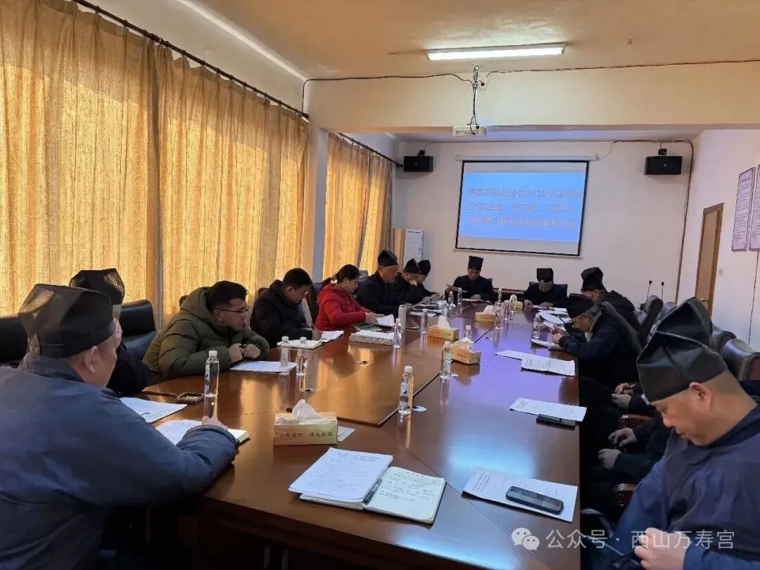 南昌讯 2026年1月23日,南昌市道教协会在西山万寿宫召开2025年度述职和民主评议暨全市道教界“学法规、守戒律、重修为、树形象”教育活动专题检视会。南昌市民宗局党组成员、副局长官晋出席会议并讲话。市道协副秘书长以上人员、常务理事、教风委员会成员及信众代表参加。会议由市道协会长李友金主持。