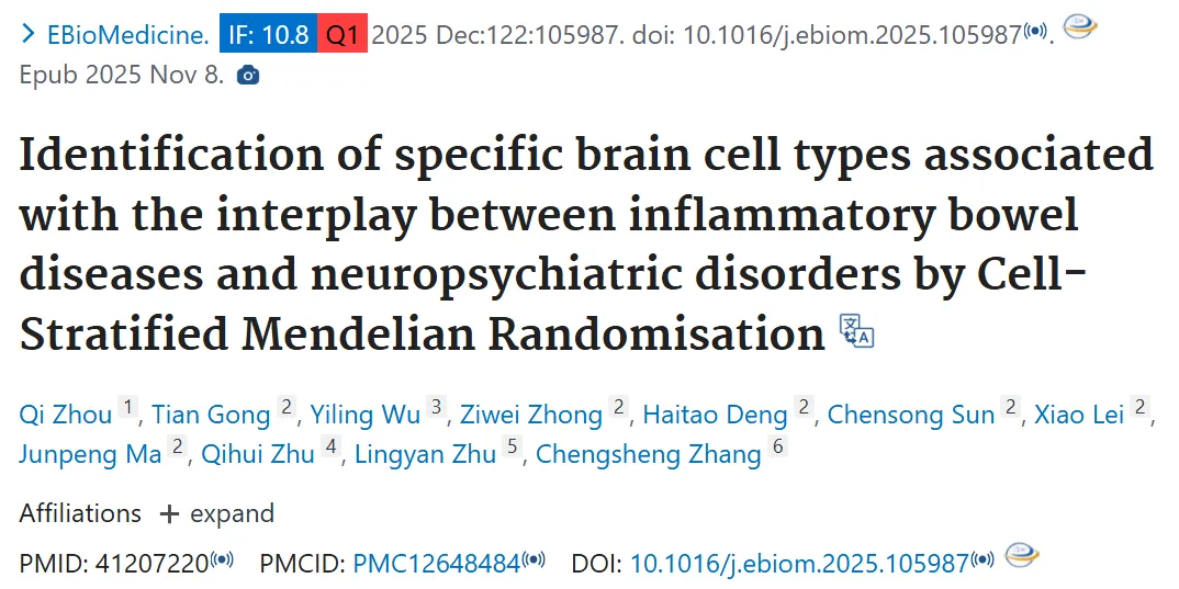炎症性肠病(IBD)与精神分裂症、多发性硬化症等神经精神疾病的关联早已被临床观察证实,但二者背后的核心分子机制始终是未解之谜。25年11月,南昌大学第一附属医院团队在《eBioMedicine》发表重磅研究,创新性运用细胞分层孟德尔随机化(csMR) 技术,结合单细胞表达数量性状位点(eQTL)和脑影像表型(IDPs)数据,首次从脑内细胞特异性视角,揭开了 IBD 与神经精神疾病相互作用的遗传调控网络。