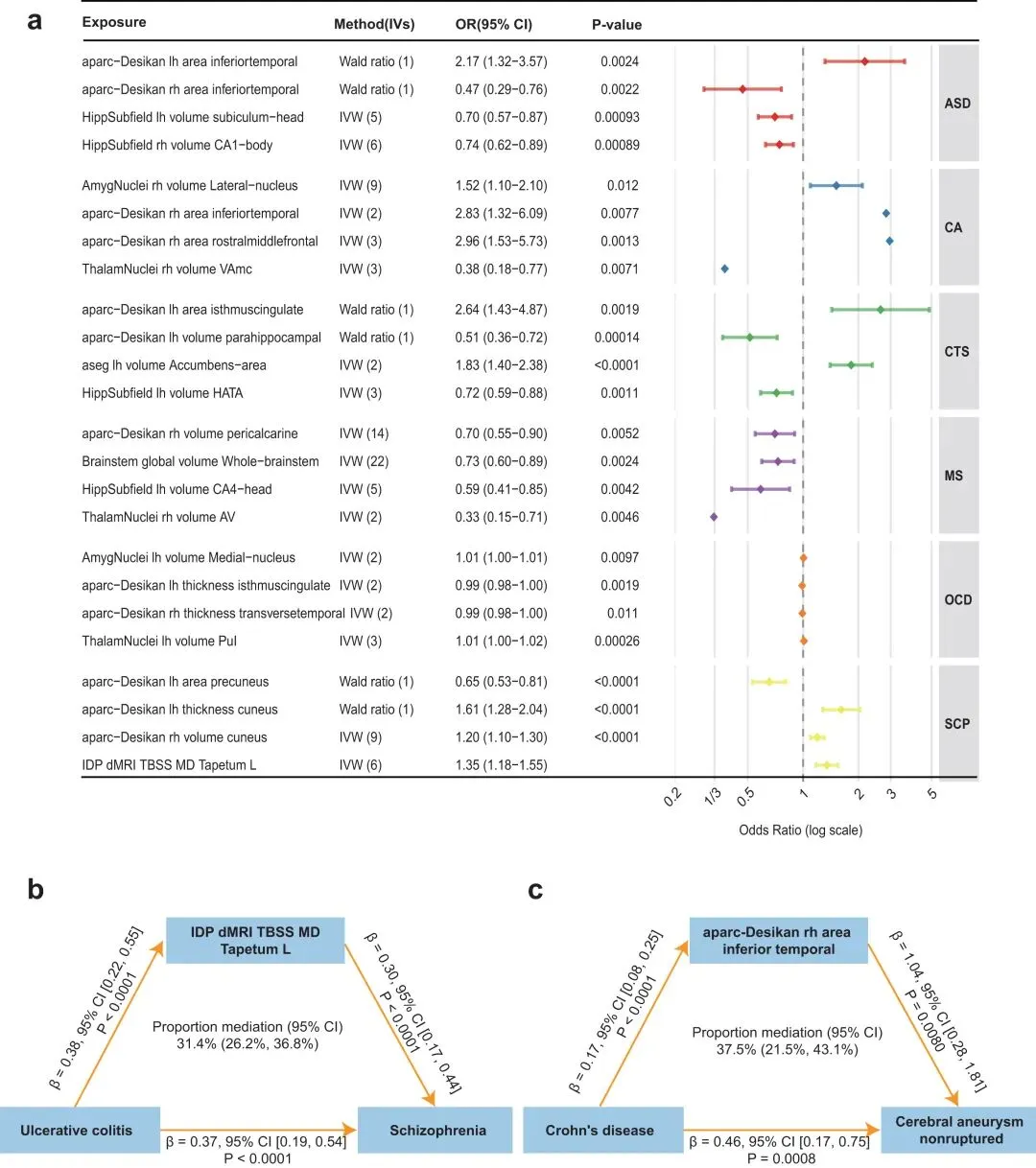 CD经少突胶质细胞分层调控,引发aparc-Desikan右半球下颞区结构改变,该IDP变化介导了37.5%的CD对脑动脉瘤(CA)的潜在因果效应,反向MR分析亦无反向因果证据。