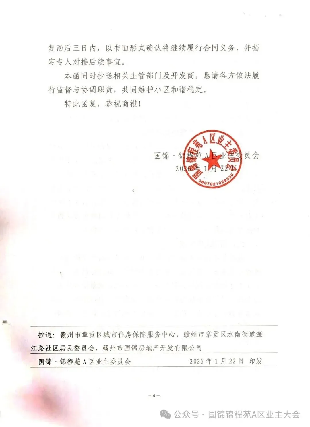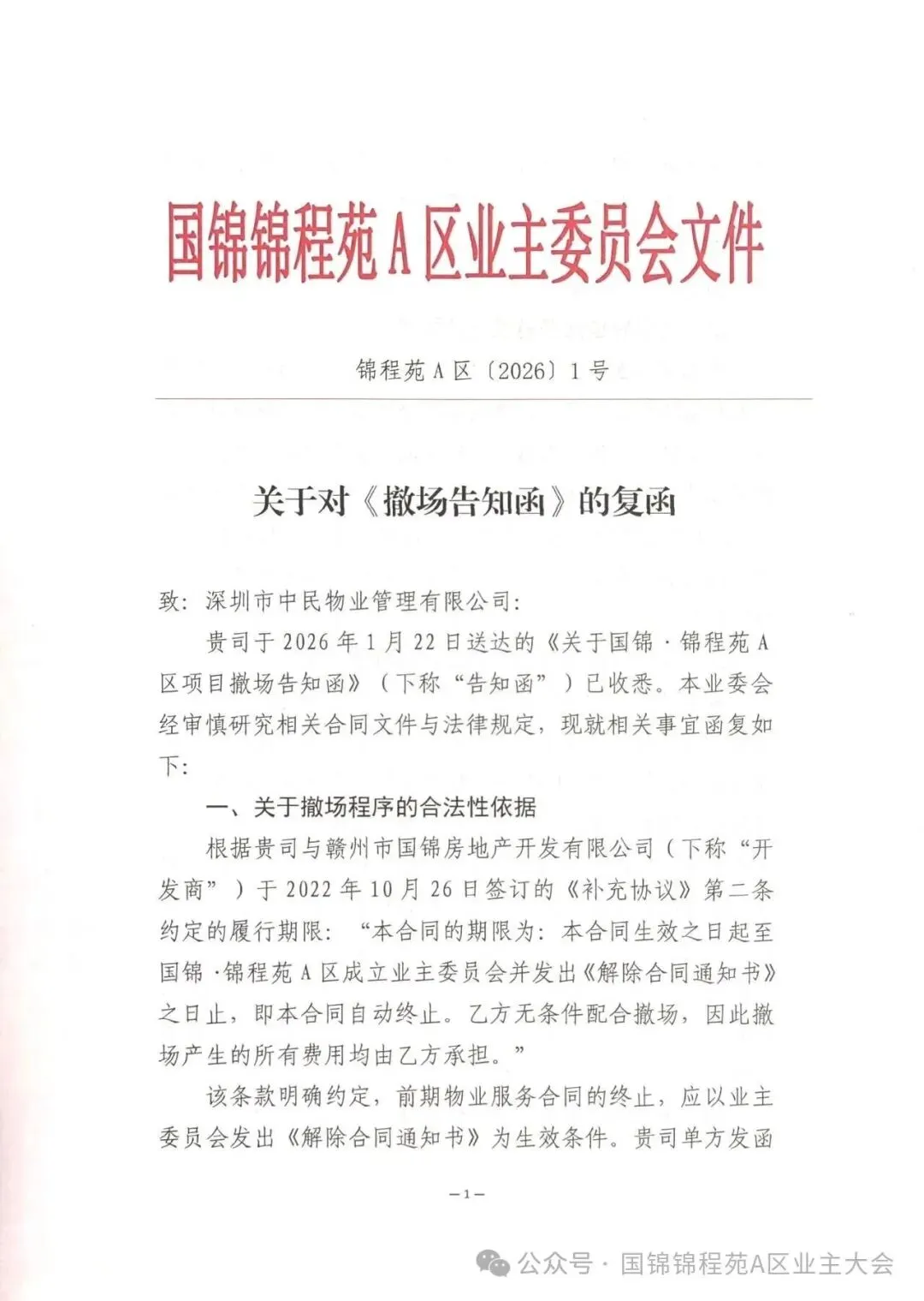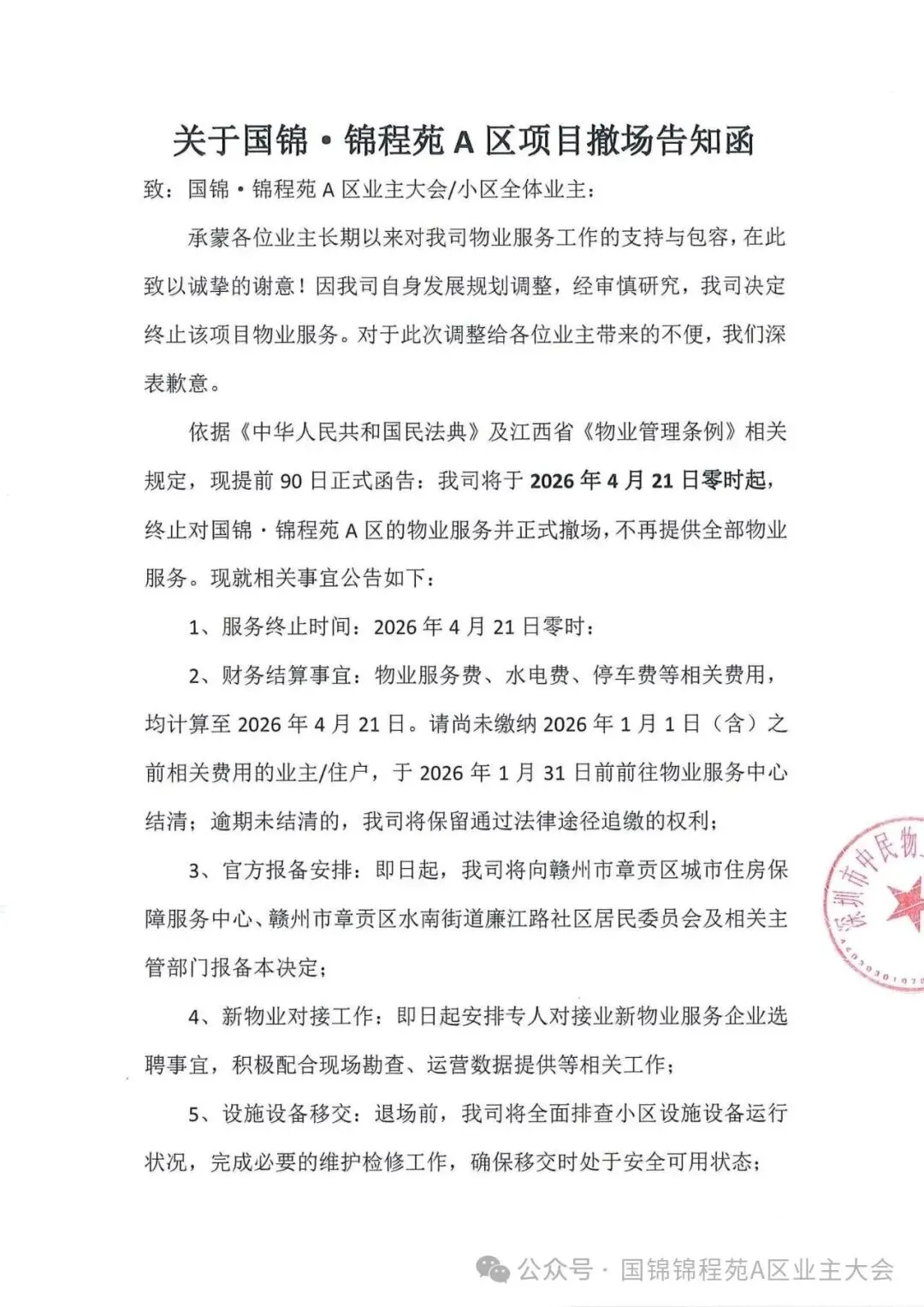 2026年1月22日,深圳市中民物业管理有限公司发布撤场告知函,因自身发展规划调整,计划于4月21日起终止国锦・锦程苑A区的物业服务并正式撤场,同时明确了费用结算、款项退还等相关安排。