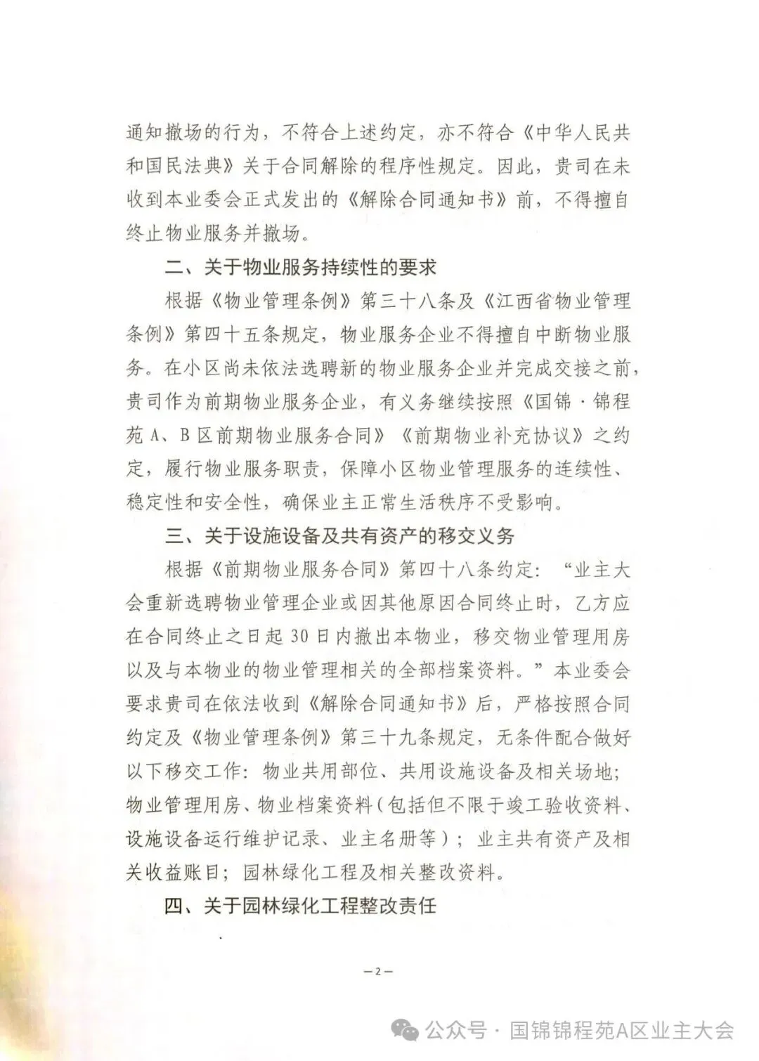 同日,该小区业主委员会发布复函,明确反对中民物业单方撤场行为。复函指出,依据双方此前签订的合同约定,前期物业服务合同终止需以业委会发出《解除合同通知书》为生效条件,物业单方撤场不符合合同约定及相关法律规定。业委会要求中民物业在新物业选聘完成并交接前,继续履行物业服务职责,保障服务连续性,并按要求完成设施设备移交、园林绿化整改等工作,若违规撤场将依法追究其违约责任。