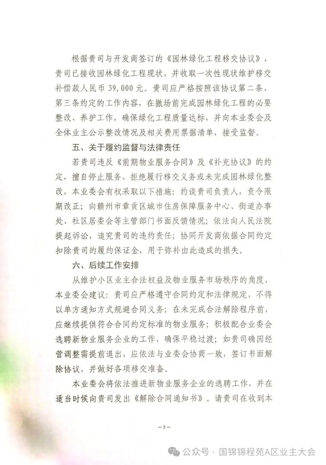 目前,相关函件已抄送属地主管部门及开发商,后续将推进新物业选聘与交接工作,保障小区业主合法权益。
