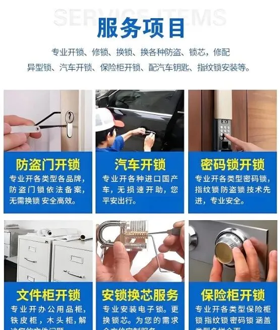 我们提供全天候专业锁具服务,涵盖家用、汽车、商用及特种锁具问题,快速响应,专业解决!同城专业修锁、换锁、配汽车钥匙、汽车开锁、配备用汽车钥匙等服务。01 同城专业开锁换锁服务热线:13 1583 95478服务8年,处理过各种紧急开锁情况。无论是凌晨还是暴雨天,只要您需要,我都在。联系电话 13 1583 95478,10分钟上门,开锁50元起!上门开锁、开门锁、开车锁、换锁、换锁芯、修锁、汽车开锁、配遥控钥匙、保险柜开锁、换锁防盗门开锁换锁芯24小时服务|公安备案|技术开锁不破坏锁开锁前必先核实身份(身份证、房产证),确保是业主本人,这是行规,更是对您财产安全的负责。